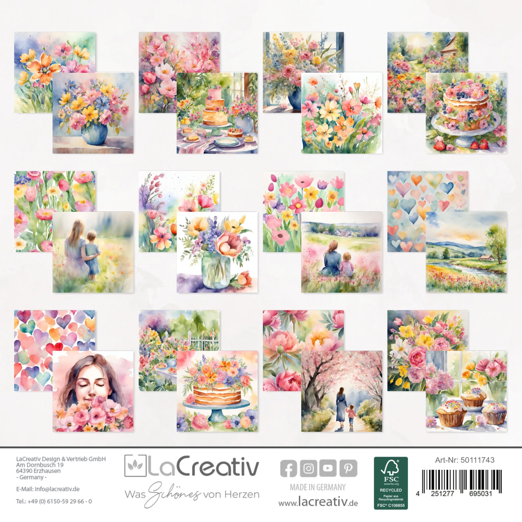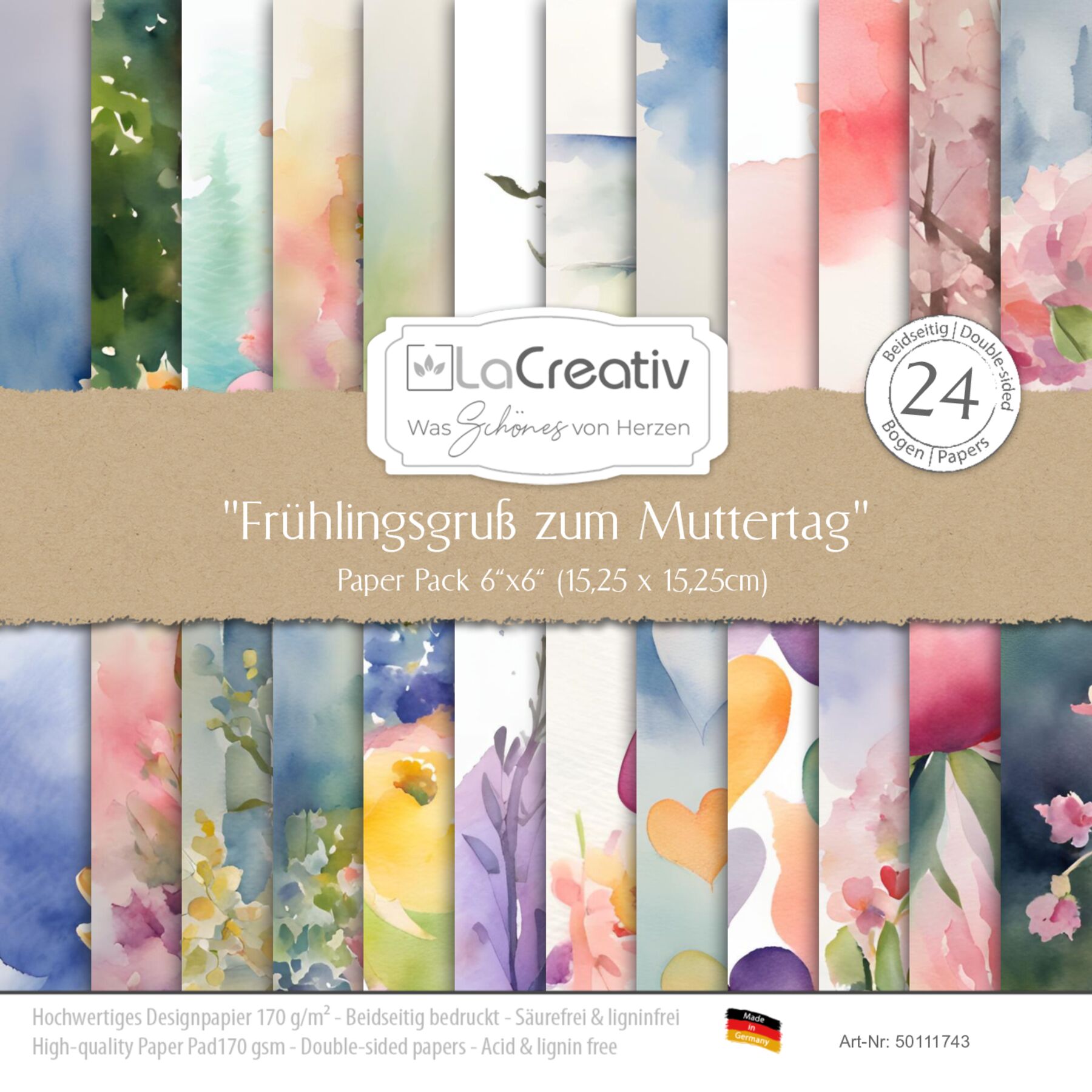 Das Motivpapier Frühlingsgruß zum Muttertag verzaubert mit wunderschönen Aquarellillustrationen in sanften, lebendigen Farben. Florale Arrangements, frühlingshafte Landschaften und liebevolle Mutter-Kind-Momente schaffen eine warme und harmonische Atmosphäre. Perfekt für kreative Karten, Scrapbooking-Projekte oder dekorative Geschenkverpackungen zum Muttertag und anderen besonderen Anlässen. Die detailreichen, kunstvollen Motive lassen jedes Bastelprojekt erblühen und strahlen pure Frühlingsfreude aus. Unser Papierset umfasst 24 Bögen mit insgesamt 12 Motiven. Die Rückseiten sind harmonisch auf die Vorderseitenmotive abgestimmt, was eine tolle und schöne beidseitige Gestaltung von Boxen und anderen Projekten ermöglicht.